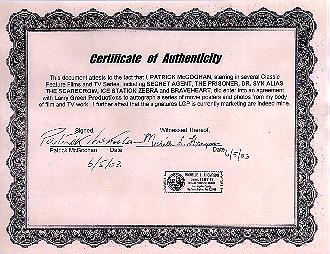 All items are hand signed by Patrick McGoohan and come with a copy of our "Certificate of Authenticity", Notarized and signed by Patrick McGoohan!